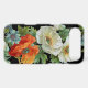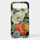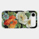 An iPhone case with pretty vintage floral art of white and orange poppies on a black background.