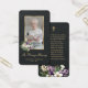Elegant black and gold floral photo funeral/memorial/prayer cards featuring a floral arrangement with purple flowers, white orchids and greenery.