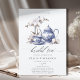 A modern classic, sophisticated, elegant and chic bridal shower tea party invitation template featuring a watercolor painting of white orchids and an elegant tea set with a Hamptons style blue toile pattern. A dreamy, romantic atmosphere enhanced by the romantic, elegant calligraphy. Perfect for a bridal shower tea party that is elegant, classy and modern, and brides who love orchids.