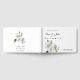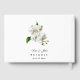 This guest book is shown in a lovely white orchids floral print on the front and back of the book. Personalized names and wedding date shown in a black color. Backside has a same floral image along with personalized names and date near bottom.