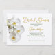 White orchids bridal shower invitation template. Horizontal cards shown on warm ecru paper with realistic stem of orchids decorating the left edge. Shower title and honoree’s name are in modern script. Warm gold colour script is combined with dark green printed text. This pretty shower invitation has paper upgrade options, such as the one shown. Reverse is dark gold colour.