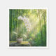 Potted orchid plants with white blossoms are illuminated by sunlight filtering through a bamboo forest.