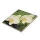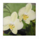 With a bit of a retro fabric look, two ivory white orchids are the focus of the original photograph by MaeFlowers on this small Ceramic Tile. The beautiful flowers are in full bloom, seen closeup against a soft focus background of natural greens in the garden, ferns and other leaves, and lawn grass. The blooms have yellow parts at the centre, and a new, pale greenish bud emerges in the upper right of the photo. This high contrast design will add a bit of nature to your life.