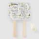 Hand-held wedding program on a stick with white orchids. Realistic orchid flowers cover the background over pale silver grey colour. On the front of the rectangular cards, “Welcome” text is at the top. Add the names of the couple in script along with the location, date and time of ceremony. The second sheet is for the back of the program with a paragraph template to hold the wedding party names, and all other info for the wedding and reception. It also has the same pretty orchids and buds image.