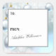 A Christmas gift label that makes it makes it easy to label your gifts. The design features a background of white Christmas ornaments. These labels can be a very helpful time saver if you decide to have your name printed on each label in the "From" section (as indicated). You hand print the recipient's name. All text is easily changed by using the template. For any other changes (different type font, color, size or placement) select "Personalize this template" then select "Edit using Design Tool." These sticker labels come in two sizes. See Options for the size you prefer.