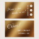 Want to offer your guests a way to enjoy several alcoholic beverages during your reception or party without being committed to an open bar? These 3 punch drink tickets could be ideal for you! In a pretty white modern script font, the message on the front reads "Have some drinks on us!". The pretty script text is editable, should you wish to use a different message. Rotated, to the right and placed between slim lines are the words "Redeem at the Bar"; this text is also editable. Three numbered circles were then added so your guests can have their cards punched at the bar as they're served up to three complementary drinks. Below the word "Cheers!" the other side has template fields set up for your names and date. Just use template fields to add your personal details and reword any of the phrases. All layers were added over a faux metallic gold effect graphic. Designed by Melody Watson for Paper Muserie.