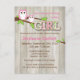 This white owl baby shower invitation has a momma owl and baby with chevron print and polka dots in pink and white. The wording "girl" has chevron, plaid, polka dots and scroll prints in pink, lime green and white. The background is a graphic barn wall and this postcard invitation has wording to be changed on front and back.