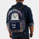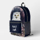 Backpack floral painting portrait features a white owl with black marks framed by flowering plants against a night sky.