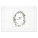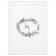This simple white holiday tablecloth features a wreath of evergreen branches, leaves, and berries with a ribbon that reads Peace and has an area in the centre of the wreath you can personalise with your monogram initial. A muted white trim edge is evident on all four sides.