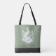 Elegant, ornate, white peacock illustration on a sage green background. Customisable monogram in elegant modern calligraphy.