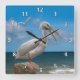 This gorgeous American White Pelican is known for his vivid blue eyes and pink eye rings. He develops a knob on his beak during breeding season. He is seen standing on a rock at the edge of the water, and a seagull is flying overhead. The blue sky filled with puffy clouds and the waves of the blue green ocean is his backdrop. Customize by adding your own caption, name, or monogram.