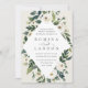 Our White Peony wedding invitation surrounds your wedding day details with a modern geometric frame of painted watercolor greenery, botanical foliage and white rose and peony flowers.