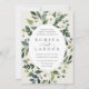 Our White Peony wedding invitation surrounds your wedding day details with a graceful oval frame of painted watercolor greenery, botanical foliage and white rose and peony flowers.