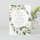 Our White Peony wedding invitation surrounds your wedding day details with a round frame of painted watercolor greenery, botanical foliage and white rose and peony flowers, set off-centre at the upper left for a fresh, modern look.