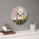 White persian kitten in a wicker basket with flowers surrounding surveying her world cat lovers wall clock. Background is beige, numbers can be removed
