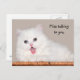Cute white persian kitten with her mouth open as if talking misses talking to the recipient of this postcard fun for cat lovers