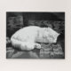 Puzzle in a beautiful, white Persian cat, peacefully sleeping on a Southwestern blanket, in white and shades of grey