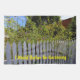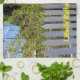 A white picket fence with a green leafy climber growing high and about to flow over the fence.