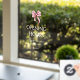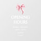 Elegant and cute opening hours window cling with a pink bow and white text for your small business. Illustrated and designed by Patricia Alvarez.