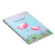 Cute soft pink and white watercolors flamingos on abstract blue ocean and pink sky accented with colourful tropical flowers.