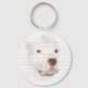 White pitbull terrier face photo superimposed onto a white brick wall photo to make a unique dog lovers key chain