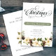 The swirly Christmas script together with the watercolor Poinsetta, berries and pine cones is a traditional Christmas designs. The white background makes it clean and elegant. The date is high lighted on a muted green colour as in the greenery.