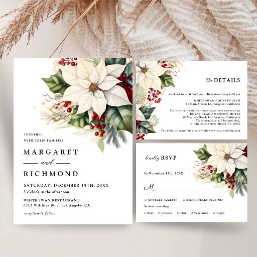 White Poinsettia & Red Berries Christmas Wedding Invitation