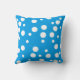 White polka dots in various sizes are printed on light blue on one side of the pillow, and on a darker shade of blue on the reverse side.