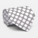 This custom necktie features a classic and stylish design with crisp white polka dots set against a sophisticated grey background. Perfect for adding a touch of personality to any outfit, this tie is ideal for both formal and casual occasions. Its timeless pattern ensures versatility, making it a great accessory for any wardrobe.