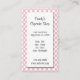 A custom business card template with script and friendly serif letters for your name, address, days and hours and more info on a clean white background with a drop shadow against a white polka dot pattern on red. Change fonts, add your own logo and more, even save your design for later.