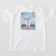 Animal Parade White Pomeranian Dog T-shirts and Sweatshirts brought to you by Imagine That! Design features our cute white white pomeranian dog standing on a patio with a flower yard and textured blue sky behind with a fun wavy purple border painted by our talented children's book artist, Traci Van Wagoner. See the fluffy white dog coming and going with this fun artwork of the playful pup’s head on the front and the funny dog's tail on the back. Show your best side coming and going today and bring some smiles to the world. Woof!