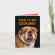 Cute English Bulldog claiming that this IS his costume. The proof is the inside photo, he's actually a foo-foo poodle! Or whatever breed you want to change it to (replace the poodle photo with your own pet)! Which ever breed this dog is, he/she deserve treats! Fun Halloween card for dog lovers.