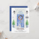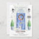 Announce your new address with our stylish announcement featuring a white poodle, blue front door, welcome mat, slate sign, topiaries and a floral wreath set on a grey brick background.