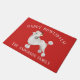 Adorable Christmas doormat featuring a white Poodle wearing a santa hat on a festive red background.
