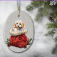 On the front of this Holiday ornament is an image of an adorable white Poodle puppy dog peeking out of a red and white Christmas gift bag. The bag is nestled among pine boughs and pine cones. Behind the image is a gold confetti sprinkle background. The back of the ornament has several text fields for you to personalise each ornament. Perfect for a daughter, son, niece, nephew, granddaughter or grandson who loves dogs, especially Poodles!
