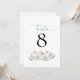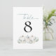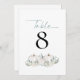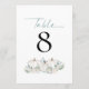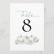White Pumpkins Florals Teal Wedding Table Number. Pastel clors for your fall wedding with three white pumpkins and florals with teal foliage beneath the table number which you can easily personalise. Table is at the top in an elegant set script. The same design is on the other side.
