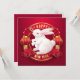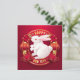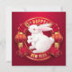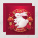 Celebrate the Chinese New Year with a white rabbit on a red a gold background with lanterns, firecrackers and clouds.