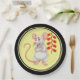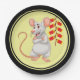 Chinese New Year plates for the year of the white rat with a cute white rat and firecrackers, yellow background, and black border.