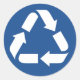 Stickers featuring a classic white recycling symbol on a dark blue background.