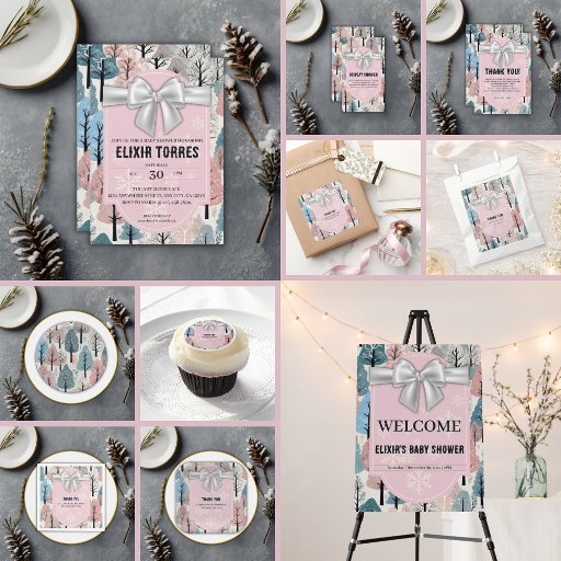 The White Ribbon Winter Forest Snowflakes Baby Shower Collection brings a touch of elegance to a winter wonderland theme, featuring delicate white ribbons intertwined with snowflakes and frosty forest elements. Soft, snowy hues and graceful pine tree designs create a serene and festive atmosphere, perfect for celebrating a winter baby shower in style. If you need any other matching product or customisation, kindly message via Zazzle.