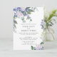 Chic wedding invitation features a summer floral design. White roses and blue/purple flowers are nestled in dark green foliage. The back of the wedding invitation is cornflower blue. This invitation is part of the White Rose Blue Floral collection. It contains the templates you need to create a lovely and unique wedding stationery set. There are also signs and other items to personalise your wedding ceremony and reception.