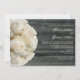 A wedding invitation featuring a background of barnwood on front and back. Front features a bouquet of white roses at left. Pesronalize the text at right with details of your occasion.