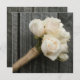 A wedding invitation featuring a photo of a bouquet of white roses with stems wrapped in burlap twine over a background of barnwood. Personalise with details of yoru occasion on opposite side, which also features barnwood background.