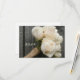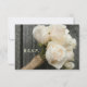A wedding rsvp featuring a photo of a bouquet of white roses with stems wrapped in burlap twine over a background of barnwood. Personalise with details of your occasion on opposite side.