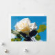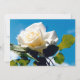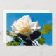 White rose under blue sky. Vibrant photo of a beautiful blooming rose makes a great floral wall art gift. The calm beauty of white rose reflects new beginnings, purity, loyalty and innocence. White roses symbolise the young love that the bride has for her spouse. White roses also symbolise the foundation of a relationship, which is why they are often seen on a wedding day. The white rose is a traditional wedding flower. White rose is a fitting flower for celebrating a new romantic and marital bond.