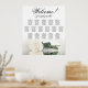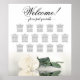 This modern floral wedding seating chart boasts 16 tables with a romantic design featuring a stunning ivory, white, or cream coloured rose lying on its side, reflecting in a water pool. The title, "Welcome! Please Find Your Table," is elegantly written in script calligraphy lettering, and there is ample space at the bottom for the couple's names and wedding date. The chart accommodates 160 guests, with 10 seats assigned to each table, adding elegance, class, and style to your wedding reception while enabling guests to find their seats conveniently.