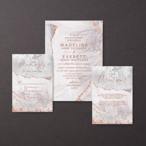 White & Rose Gold Agate Marble Foil Gilded Geode Design, with Modern and Script fonts. Trendy and Chic Wedding invitations! ~ Check my shop to see the entire wedding suite for this design!