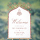 Amaze your guests with this islamic wedding welcome sign featuring an elegant arch and 'Bismillah' in Arabic calligraphy on a damask pattern background.