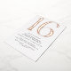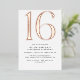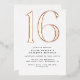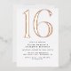 Modern style 16th birthday invitations with a large heading "16" in real metallic foil. Rose gold foil on a white background. (Background colours can be changed by using the design tool. You can also change the type of metallic foil.)