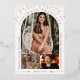 Pretty rose gold graduation invitation in white personalised with three photos on the cover and another photo on the back. Double sided graduation invitation printed with rose gold foil text and little stars against a white background. 2 in 1 graduation announcement and invitation personalised with a photo collage and the graduate's name in rose gold foil and congrats graduate in curved text around an arch shaped photo. Eye catching rose gold graduation invitation with pretty star details.